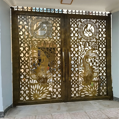 Hai bên cánh cổng là đôi cá chép dũng mãnh đang vượt sóng, thể hiện ý chí kiên cường, vượt vũ môn để hóa rồng. Đây là biểu tượng sâu sắc trong văn hóa Á Đông về sự thành đạt, thăng tiến và nỗ lực không ngừng.